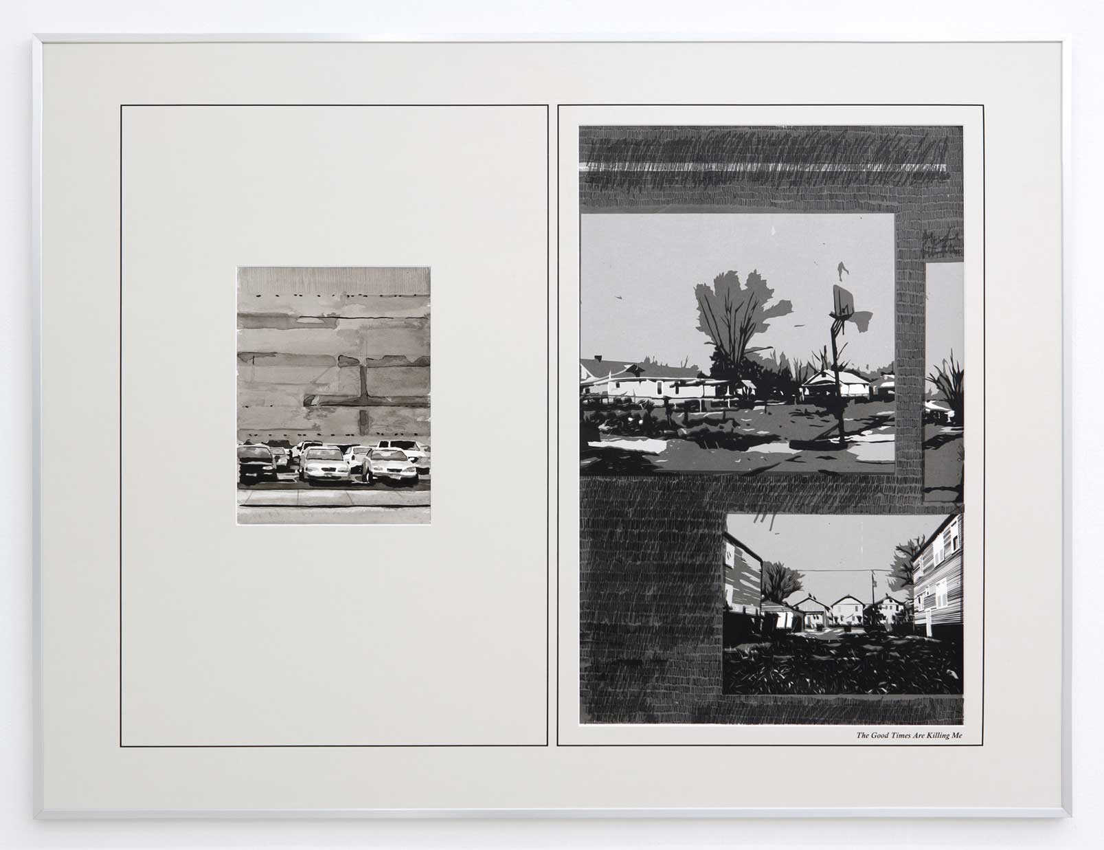 VACANT: The financial crisis is most clearly evident in the vacated and deserted properties in the (sub)urban cities of the Midwest. Here vacant means an uncertain future, a clearing away, a tearing down of houses or market correction. The codes and signs of the regression fit into Stefanie Busch’s coming to terms with the status quo of art and the business of art; she picks up on them in her new works. In »The Good Times Are Killing Me« she presents screen-prints, photographs, and ink-drawings. The source material for the new works are newspaper articles, city maps, empty advertising hoardings, architecture, but also the common or garden situations of everyday American life. Common to the subject matter is the unspectacular, the peripheral. Here Stefanie Busch searches beneath the great surface, beyond the US metropolises, for interesting and marginal realities which, however, probably portray more realistically and concretely the everyday society.